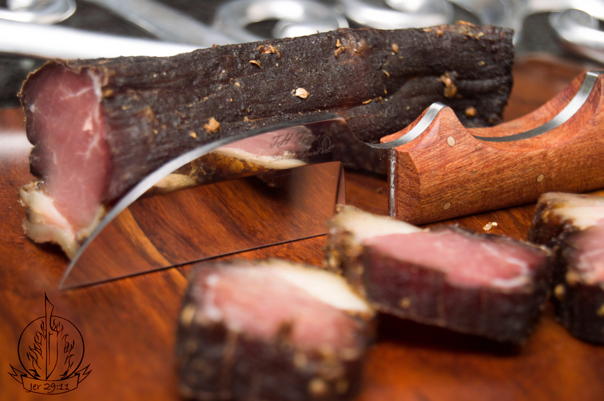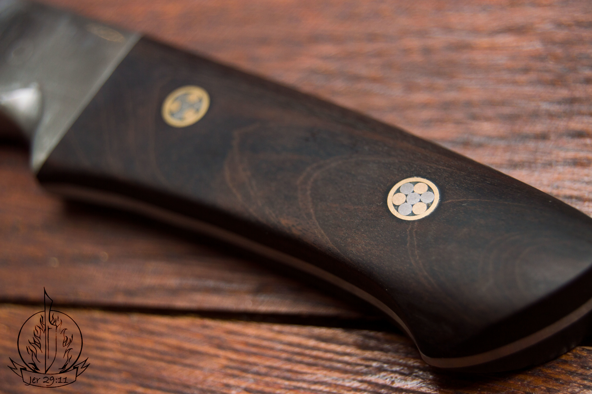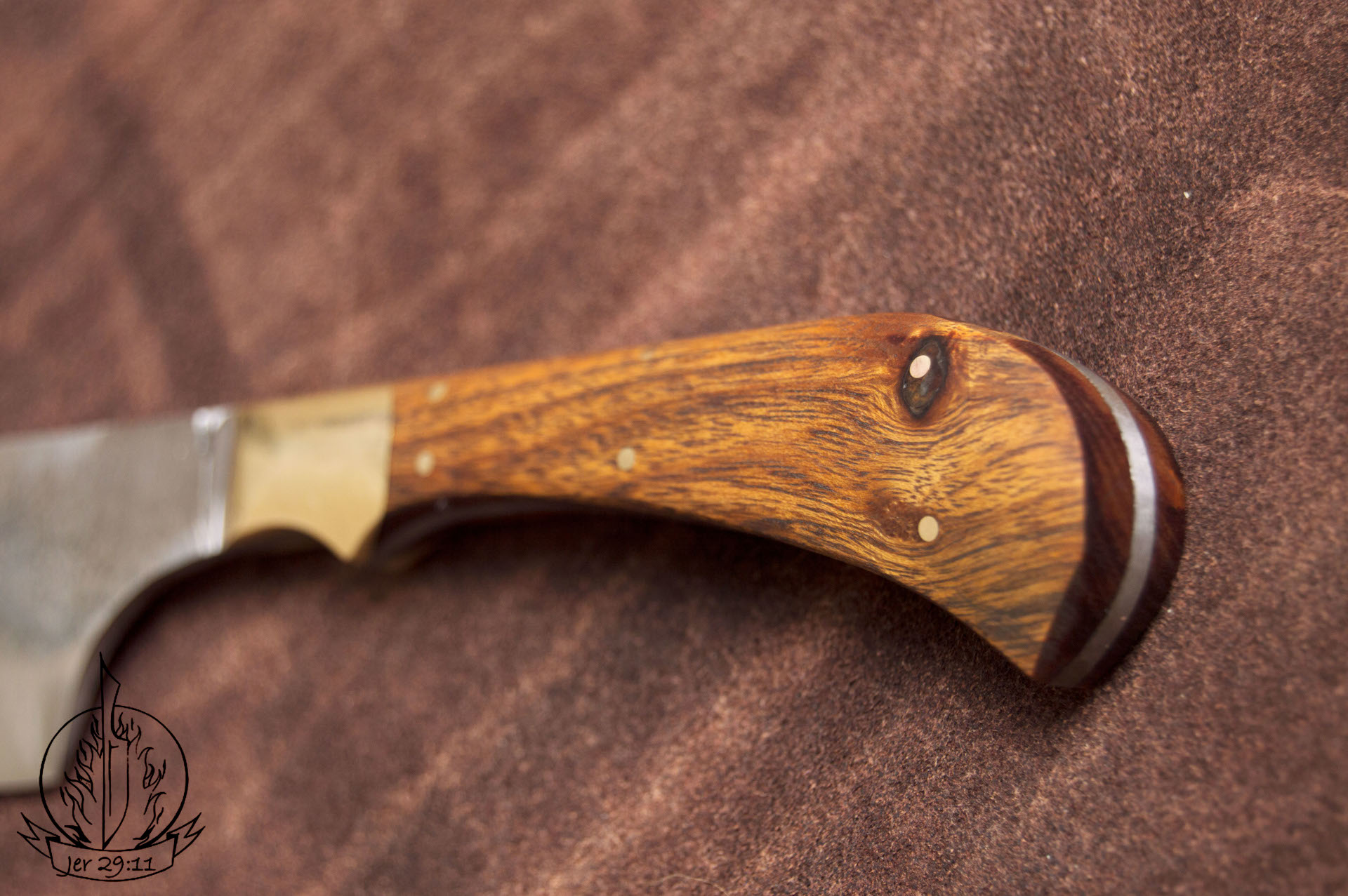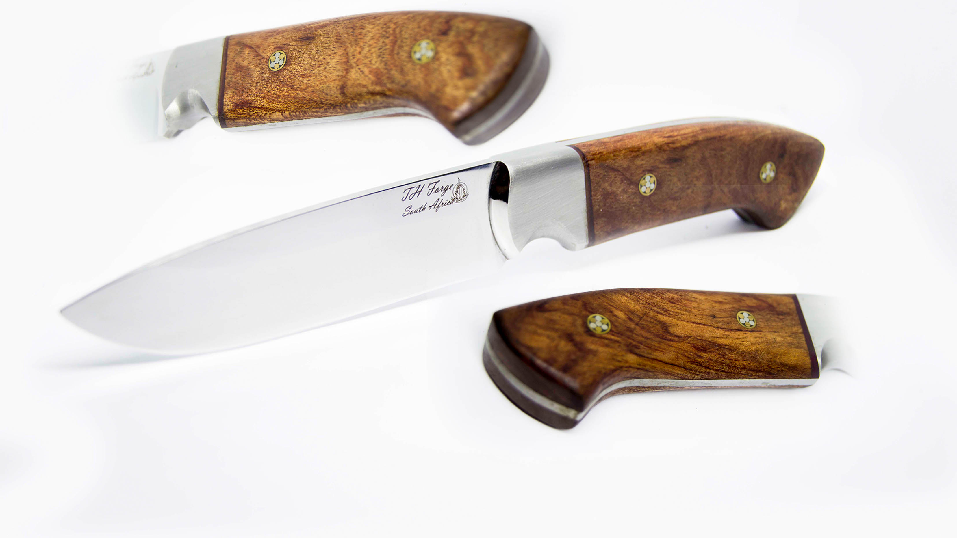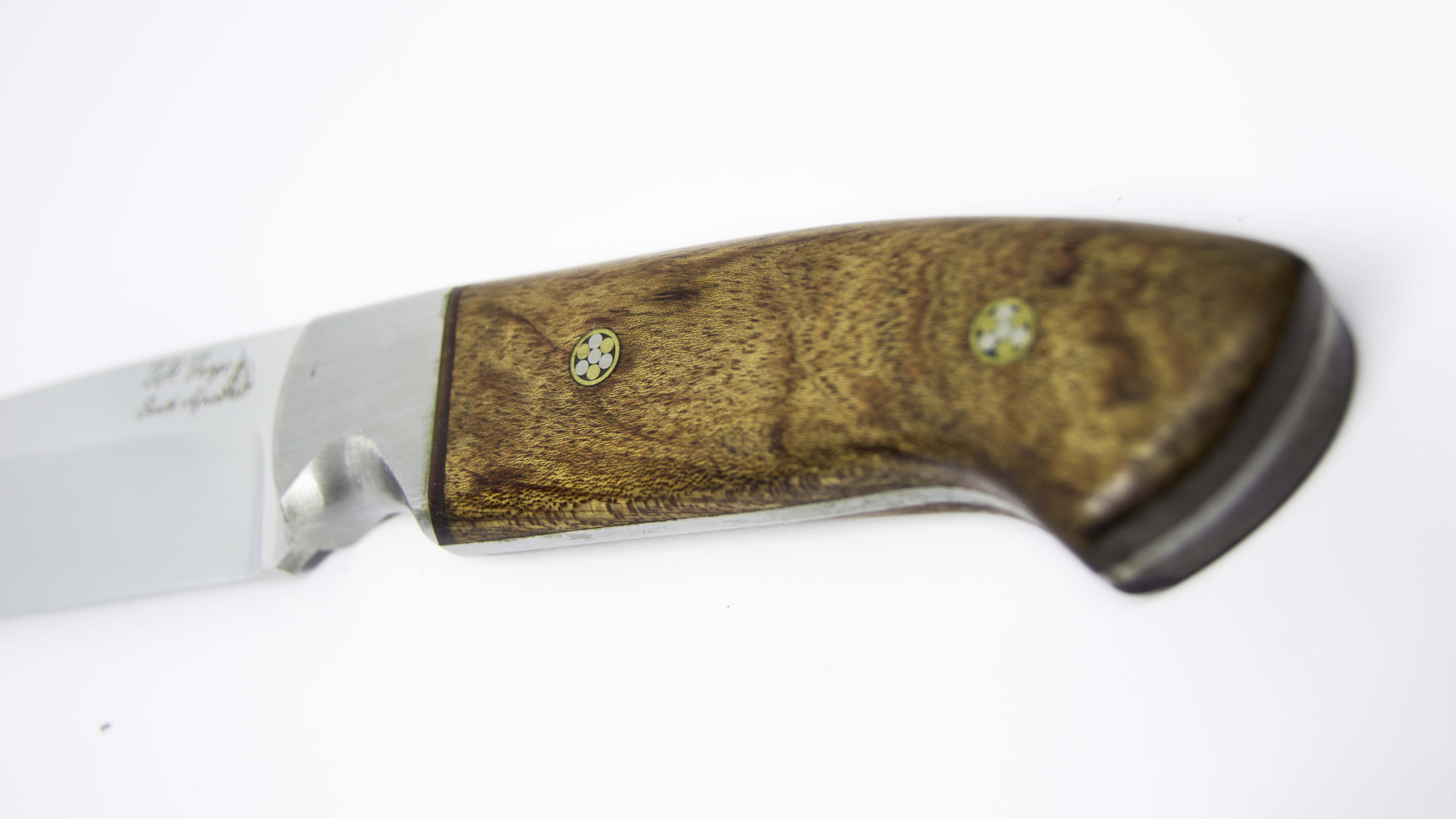 Special effort is made to find the most beautiful specimens of indigenous wood for handle material (curly African Rosewood pictured)